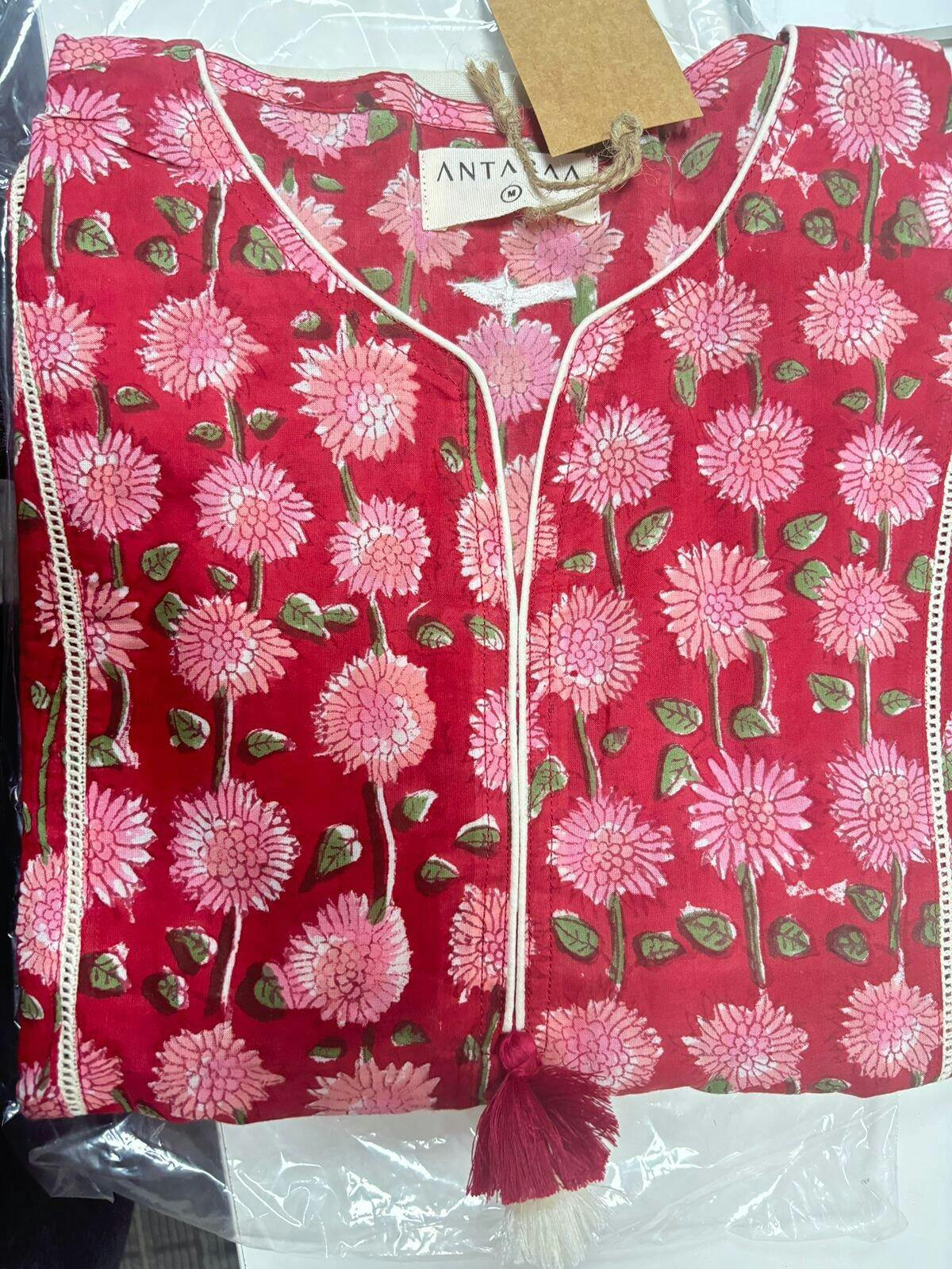 Handcrafted in 100% cotton, this breezy co-ord set features a rich red kurta with hand-block floral prints inspired by blooming gardens, complemented by playful statement frill sleeves. The relaxed silhouette pairs effortlessly with ivory palazzo pants, creating a look that’s both comfortable and expressive. Lightweight and breathable, it’s designed for summer brunches, festive day-soirees or art-gallery outings — capturing a blend of Indian craft and modern minimalism.