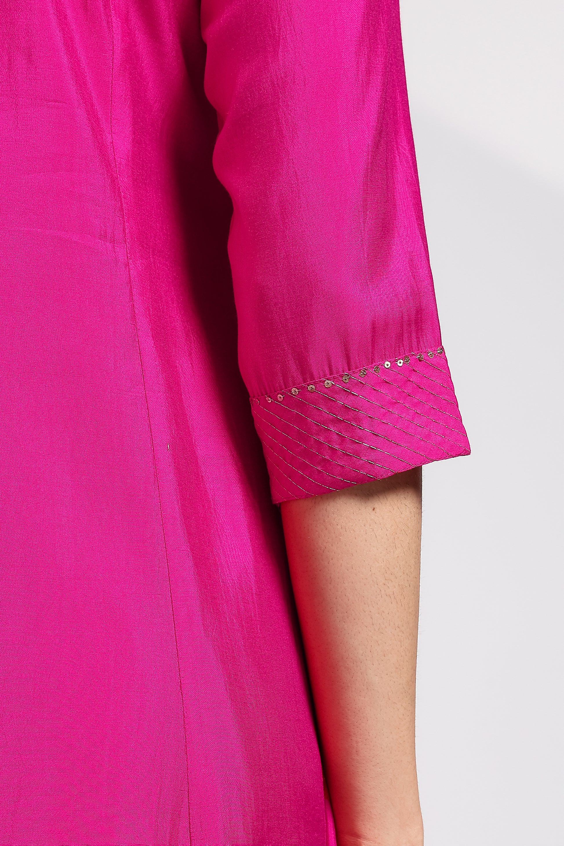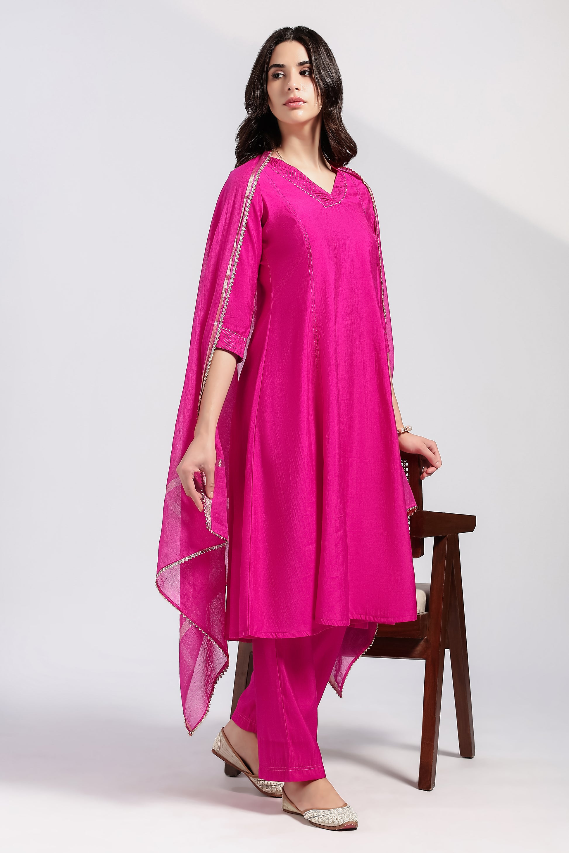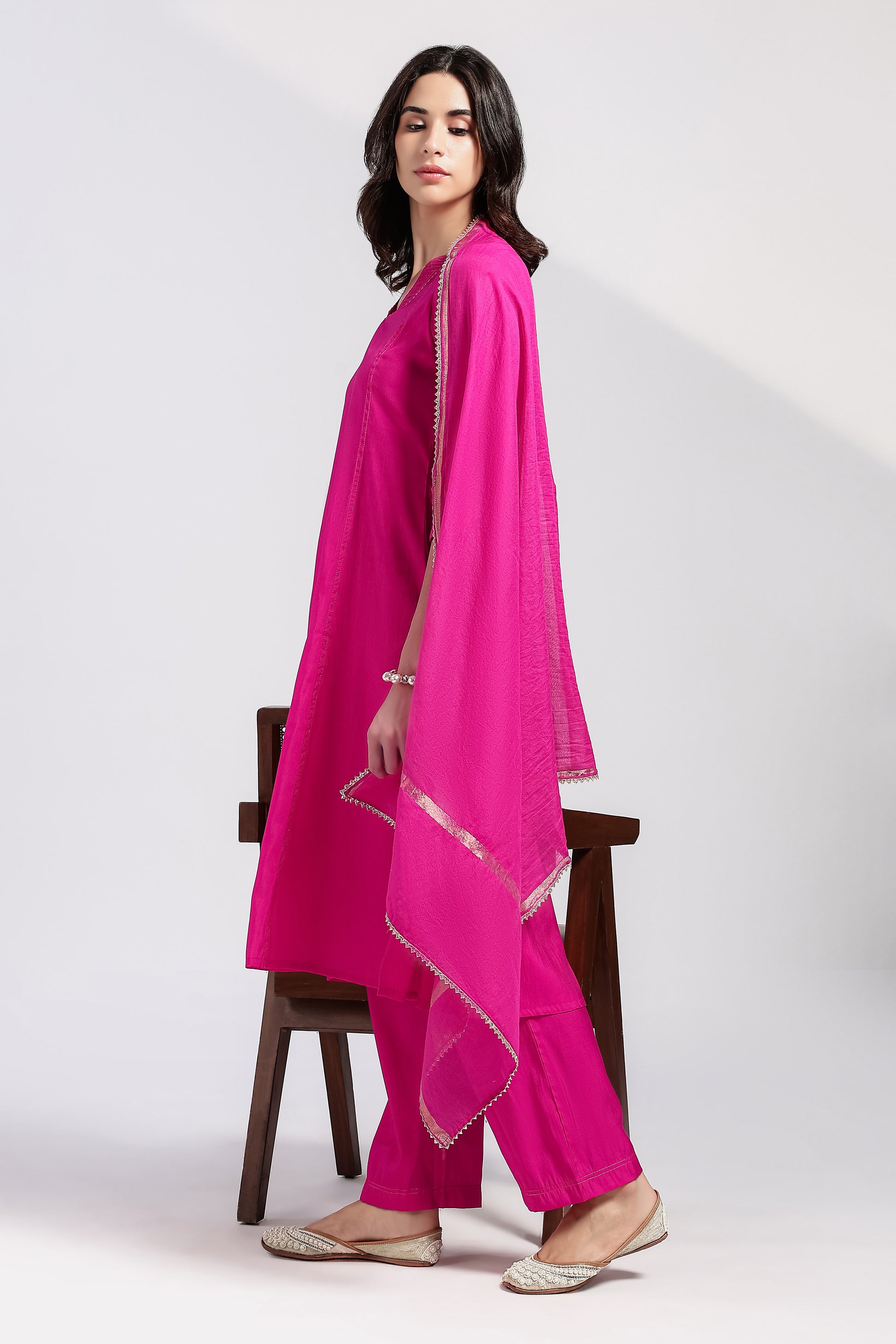Noor Kurta Set celebrates luminosity in its purest form. The fuchsia hue radiates joy and confidence, while the fine zari-trim detailing and Kota Doria dupatta lend a festive polish. Designed with a flattering V-neckline and structured three-quarter sleeves, this silhouette moves gracefully between tradition and modern ease. Paired with straight-fit pants, it’s an ode to vibrant minimalism — embodying Antaraa Studio’s signature quiet confidence and timeless Indian craft.