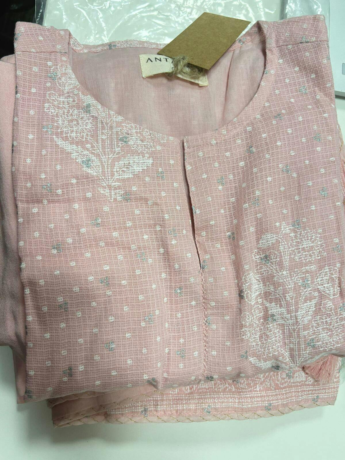 An elegant blend of grace and comfort, crafted in soft pastel pink with delicate motifs that exude femininity and charm. The kurta is made from airy Kota Doria, known for its lightweight texture and fine weave, adorned with subtle block-inspired floral prints. Paired with breezy cotton bottoms and a matching dupatta, this set strikes the perfect balance between tradition and everyday sophistication.