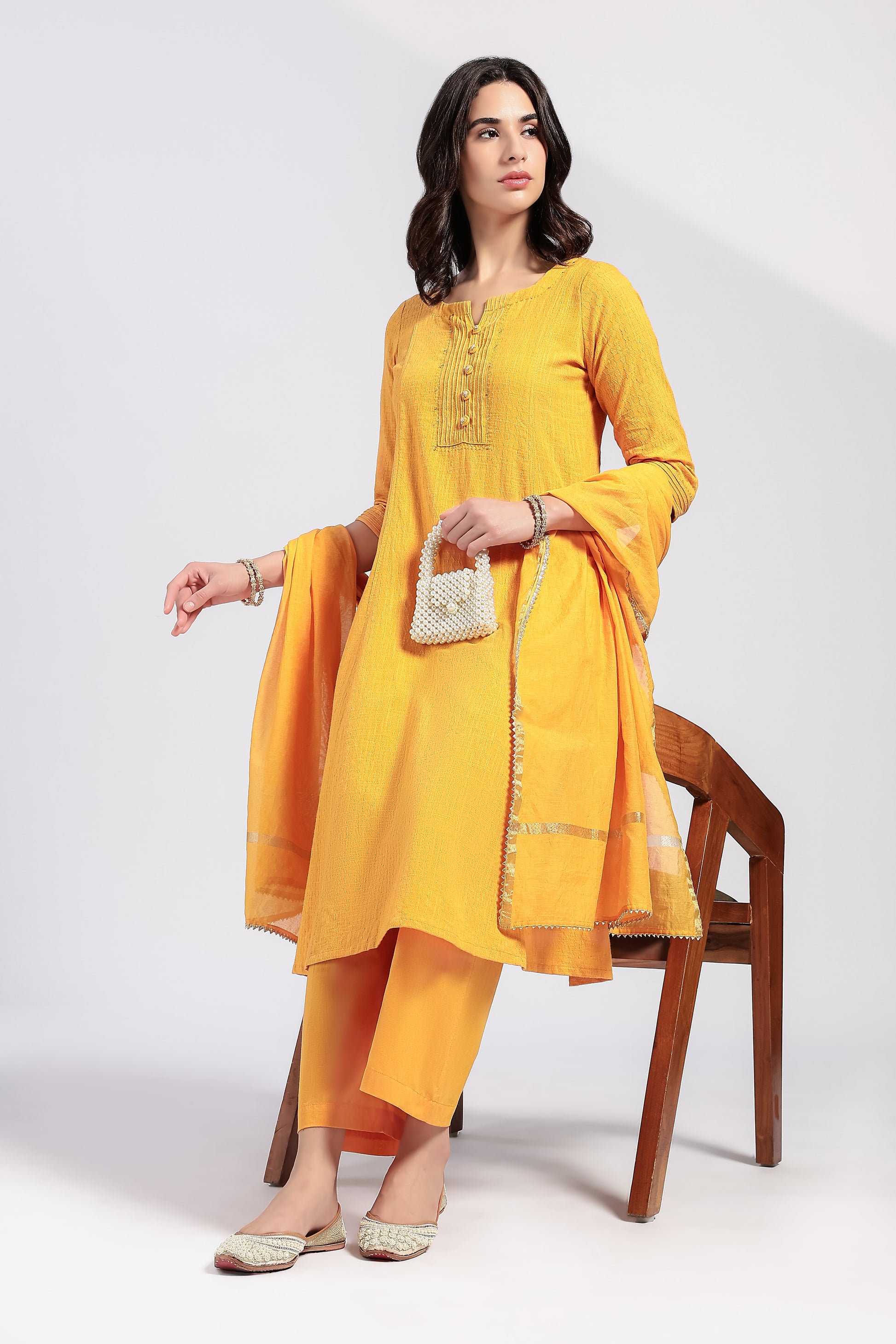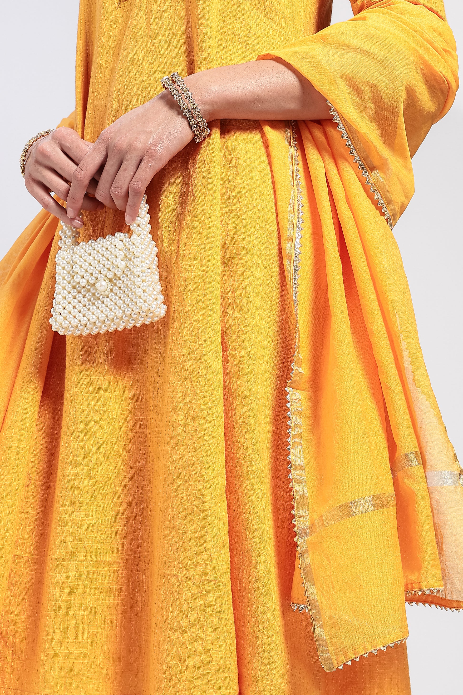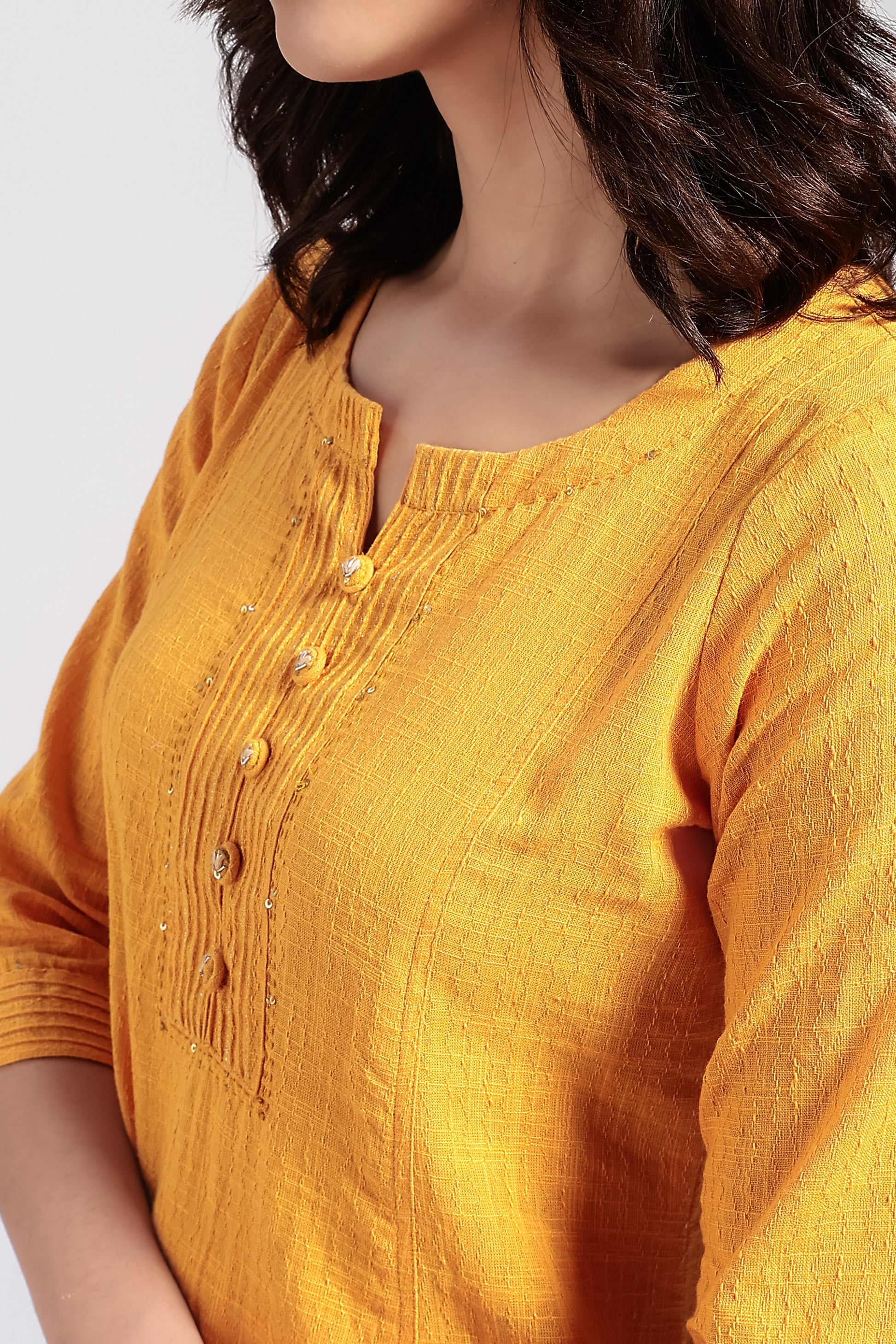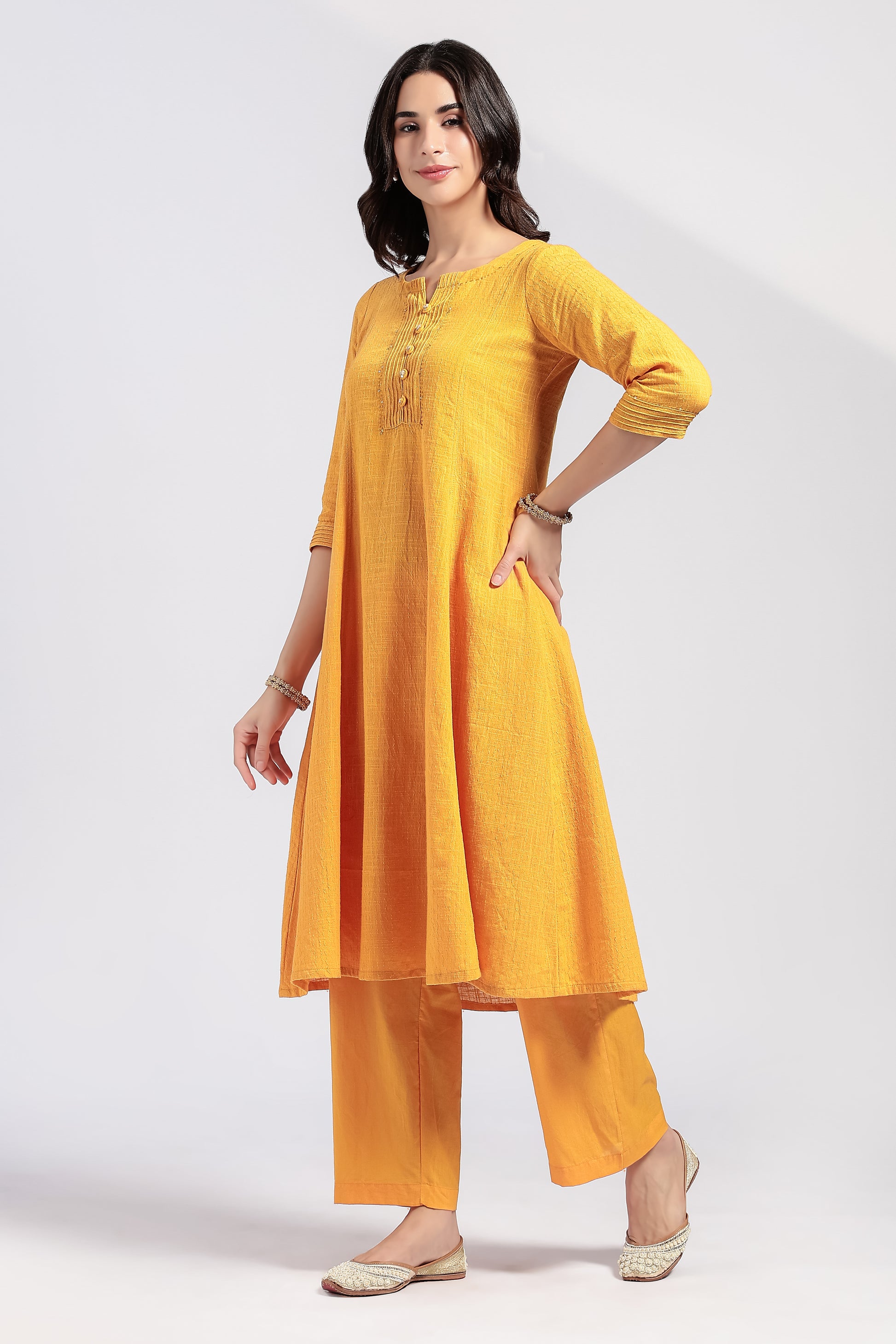 Handcrafted in rich cotton, the Sunehri Kurta Set captures the glow of golden sunlight through its warm mustard hue and artisanal texture. The kurta features A-line silhouette, detailed with handcrafted buttons and subtle zari edging for a festive touch. Paired with straight-fit pants and a light kota doria dupatta with gold lace borders, it balances everyday ease with quiet celebration — embodying Antaraa Studio’s effortless elegance and timeless Indian craft.